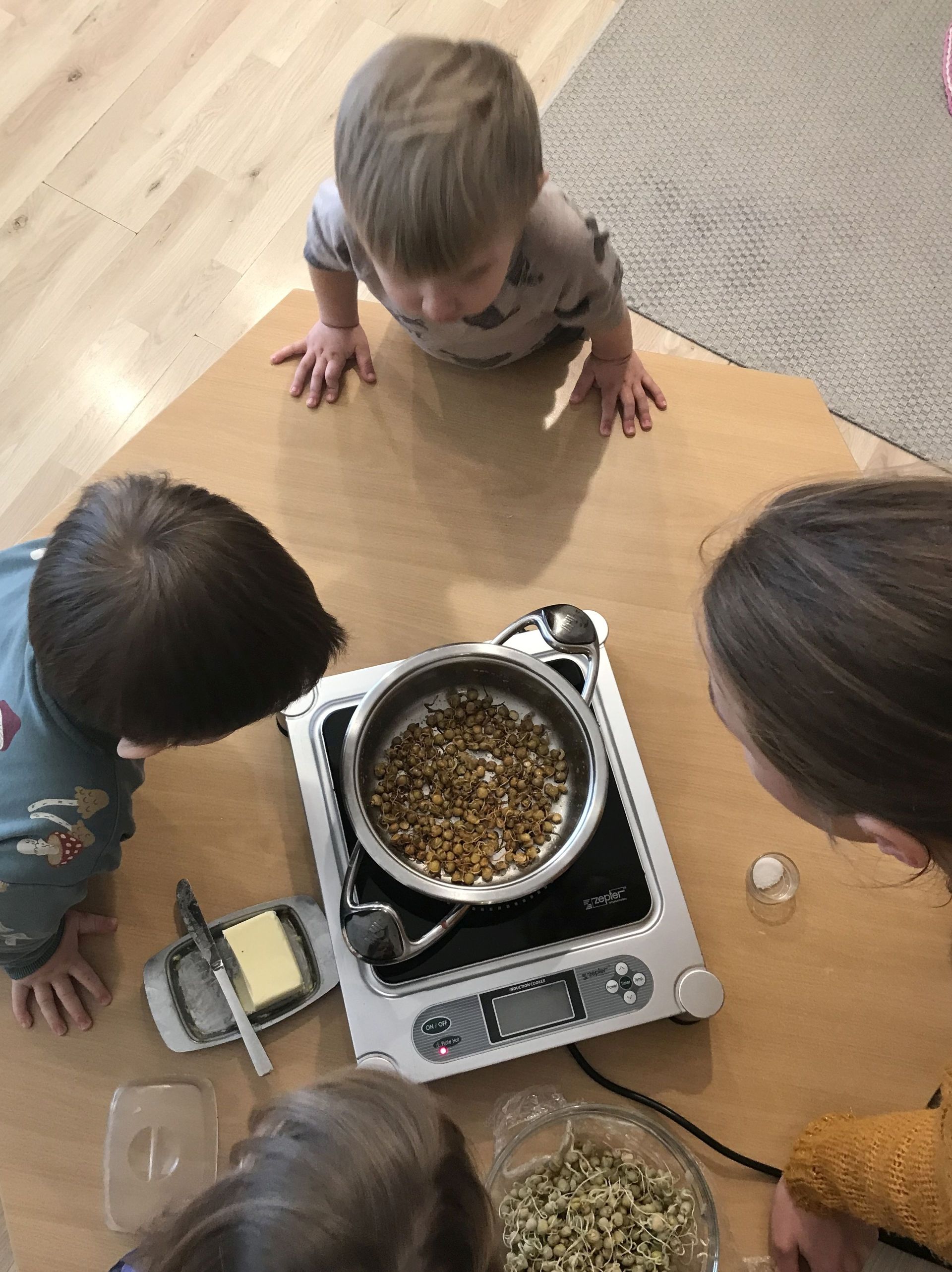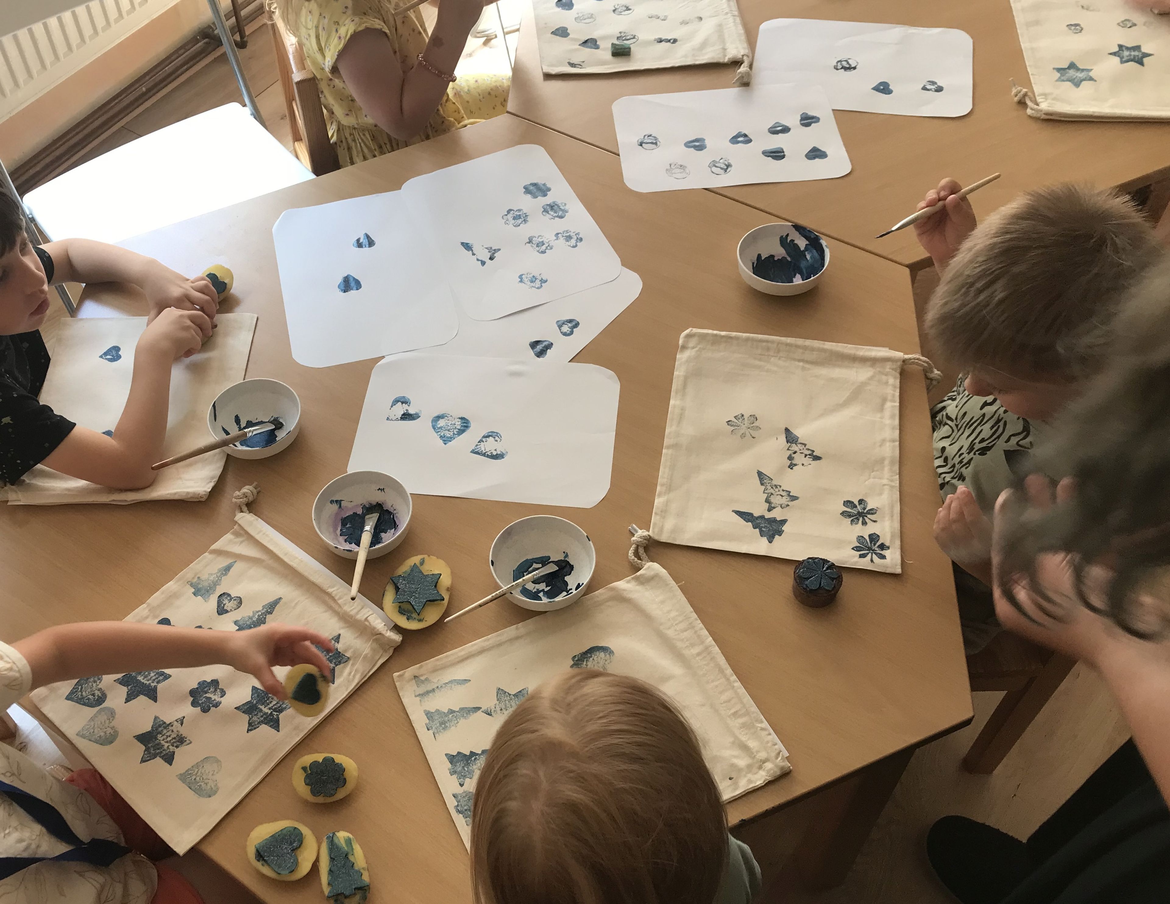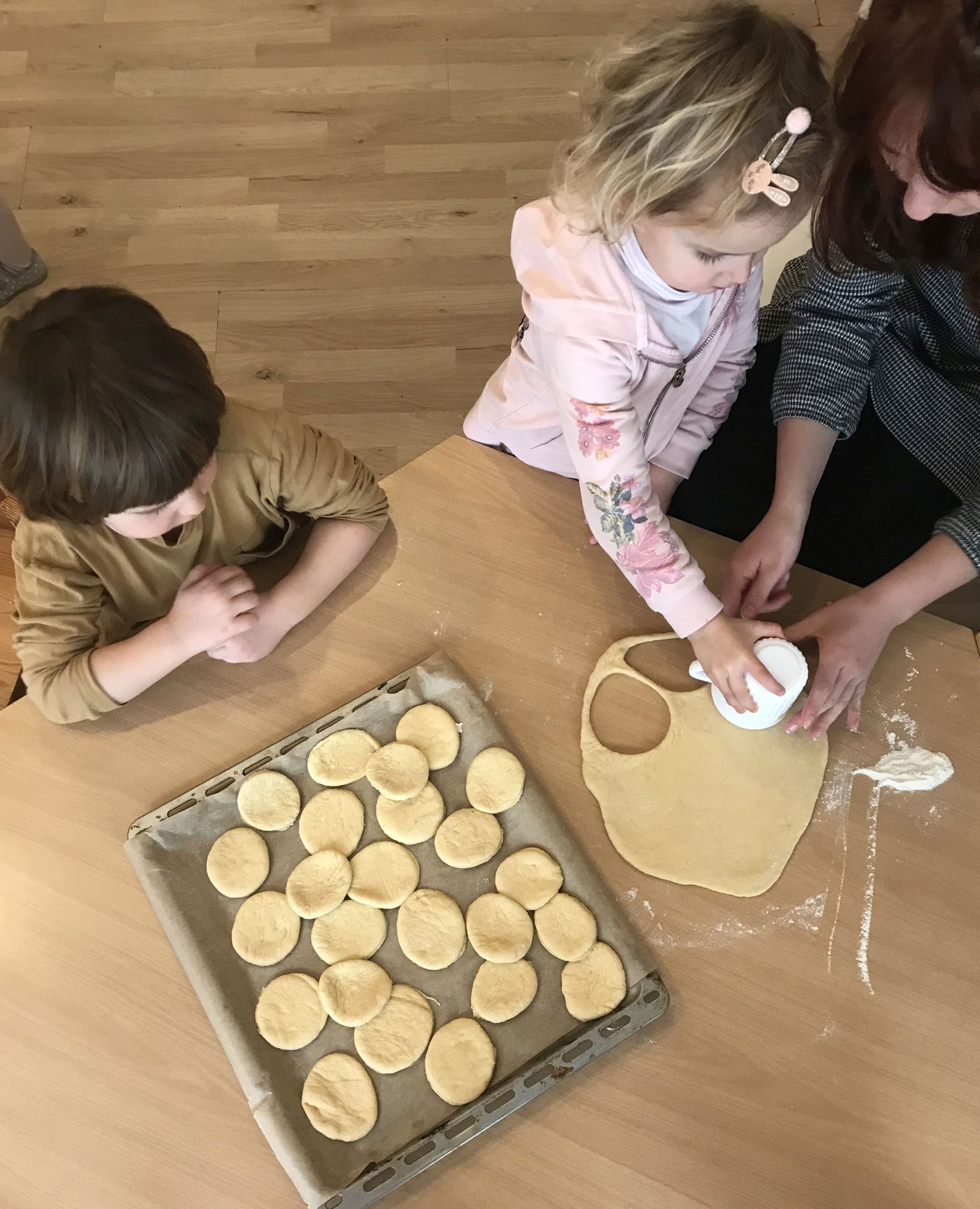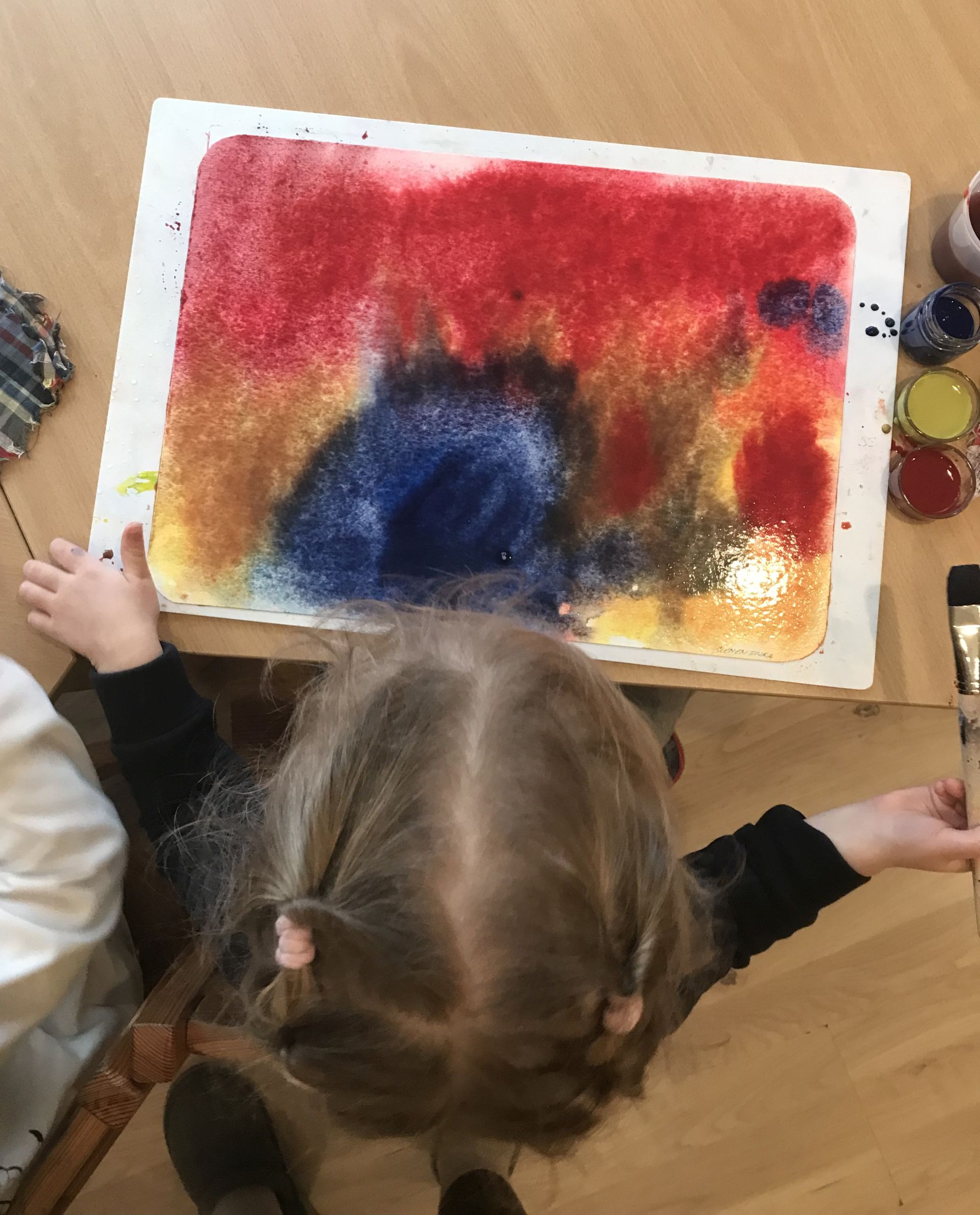 Po svačince opět následuje hygiena, služba sklízí a utírá stolečky. Písnička nás pak provede do další tvořivé části dopoledne. Každý den se pravidelně věnujeme jiné tematické aktivitě - malování akvarelem i kreslení voskovými bločky, práci se včelím voskem, s ovčí vlnou, péči o záhonky nebo velmi oblíbenému pečení. Často děti stihnou tvořit již před svačinou a máme pak více času na pobyt venku.
