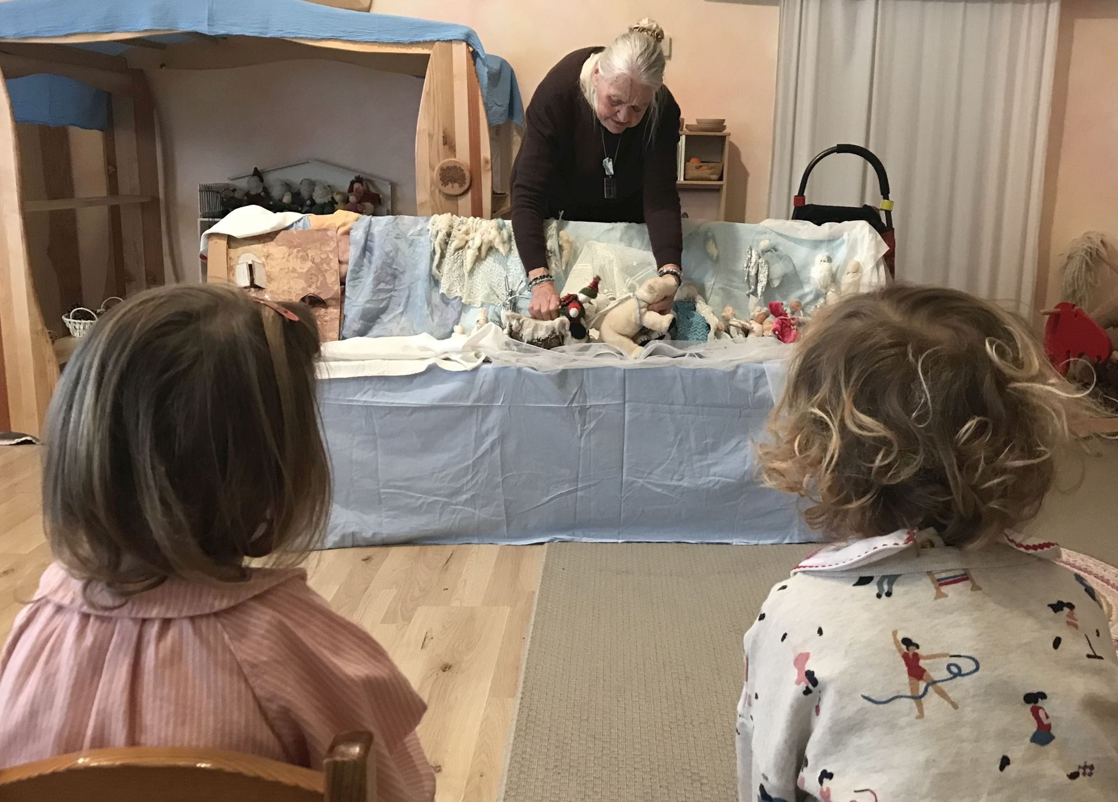 Jednou měsíčně nás také navštěvuje úžasná "pohádková babička". Ta přichází se svým kouzelným světem kulis z barevných šátků a vlastnoručně vyrobených roztomilých loutek z ovčí vlny a dalších přírodních materiálů. Ve starých knihách vyhledává zapomenuté pohádky plné živých obrazů, kterými sytí dětské duše. Pohádky rovněž přizpůsobuje koloběhu roku a děti si také mohou opatrně prohlédnout a osahat loutky.